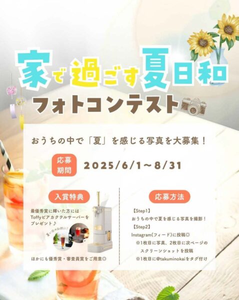 協同組合匠の会がInstagramを活用して実施する「匠の会フォトコンテスト」に応募の方は、以下をよくお読みいただき、同意の上応募してください。本キャンペーンにハッシュタグ#家で過ごす夏日和 を付けて投稿された場合には、規約に同意したものとみなします。