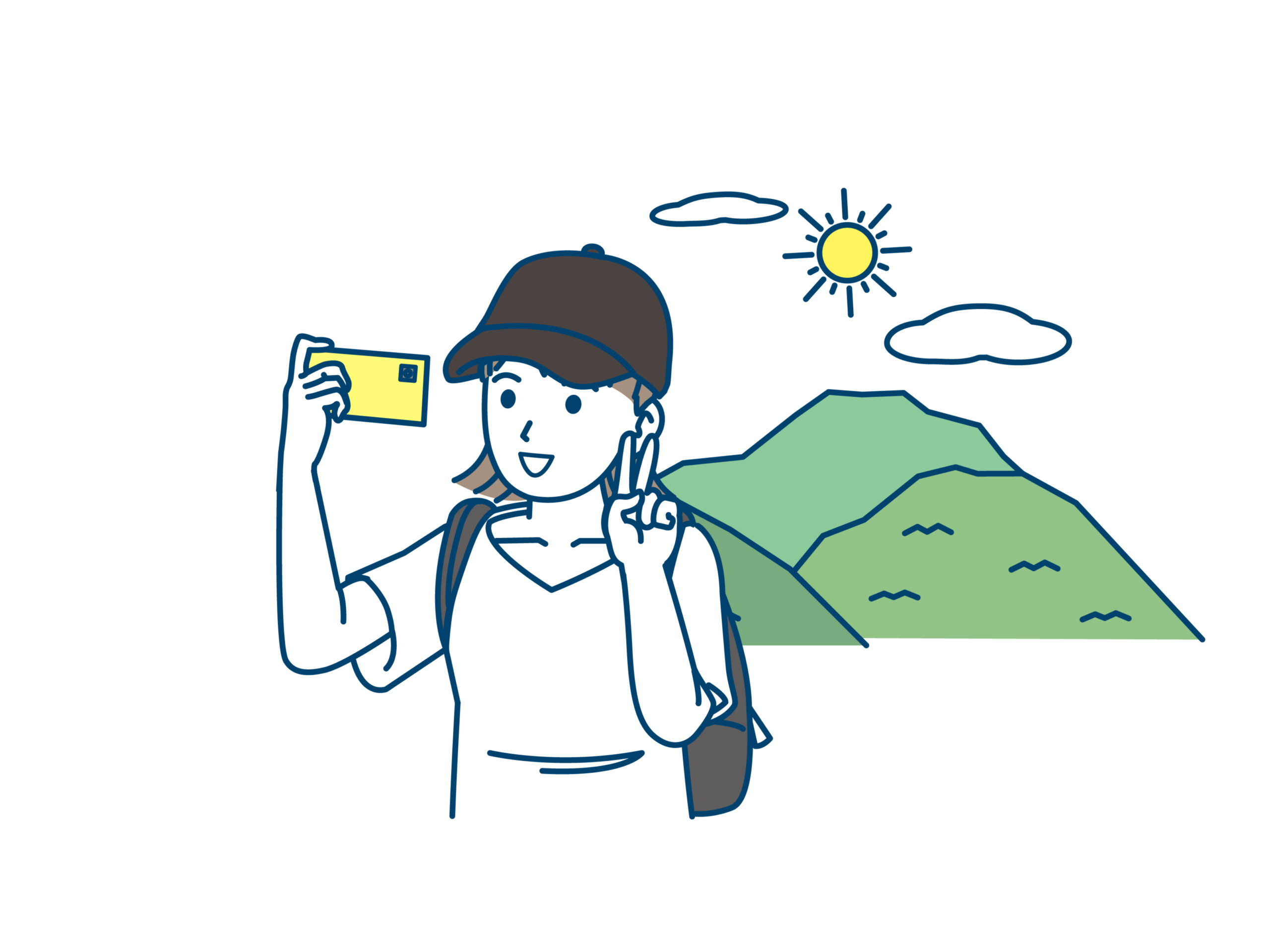 ハイキングや登山、スマホで自撮りする若い女性のイラスト